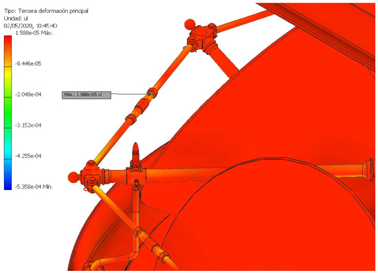 Finally, the equivalent deformation that is expressed as a percentage with respect to the length of the element was studied. In Figure 27, the maximum equivalent deformation can be observed as having a value of 0.06283% of its length, and in Figure 28, the third main deformation with a value of 0.0015% of its length is shown. Therefore, it can be said that the equivalent deformation suffered by the assembly is negligible.