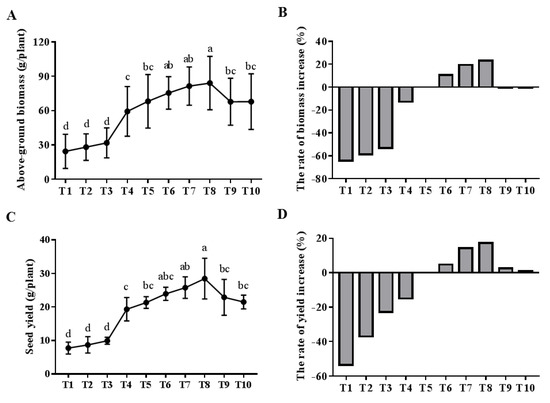 | Treatments | Seed Weight (g) | Plant Height (cm) | First Primary Branch Height (cm) | Branch Number | Pod Number | Seed Number Per Pod |