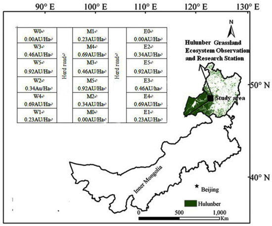 The Hulunber grasslands area forms a portion of the Inner Mongolian typical steppe ecosystem located in Northeastern China. It is one of the biggest areas of natural temperate sub-humid prairie grasslands in the world, with an estimated coverage area of 9.97 × 106 km2. Though a considerable portion of the total area has been transformed into cultivated lands in the past five decades, a huge part of the region is still used as natural or semi-natural grasslands for seasonal or constant grazing by cattle and sheep, causing 50% of obtainable grassland degradation in the area [1,2,3,4]. For now, suitable stocking rate limitation is one of the most critical and insistent means being adopted to support the grasslands adaptive management and sustainable development [5,6]. Due to the abundance of plant species with high palatability, the typical steppe has become quite suitable for making hay and grazing activities [7,8,9]. Due to the high grazing potential of the area [10], livestock husbandry controlled by small ruminants (mainly sheep and goats) has resulted in serious degradation, which can basically be demonstrated by the reduced state of canopy cover [11]. Therefore, in recent decades, the typical steppe ecosystem size and productivity has declined drastically [7,12]. The reason for this phenomenon is that, in recent decades, the shift from seminomadic to settled animal husbandry has led to the change of concentration and land use.