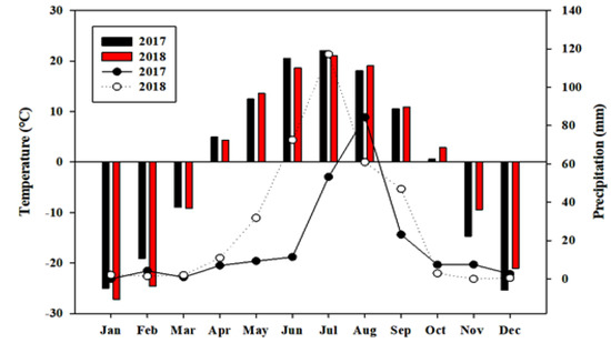In 2017, the annual precipitation of 210.9 mm was lower than the long-term average, while in 2018, the annual precipitation recorded 349.1 mm, which was almost similar to the long-term average. In 2017, the highest rates of rainfall were recorded in July and August, whereas in 2018, the highest rainfall amounts have been registered in June and July. In 2017, a drought was observed, and the average precipitation in May to September was 189.2 mm, with an 84.3 mm peak in July, while in 2018, the average rainfall in May to September was 342.2 mm, and the peak was recorded in July, with 117.2 mm (Figure 2). Generally, 2018 recorded the highest AGB, ANPP, and herbage growth rate.