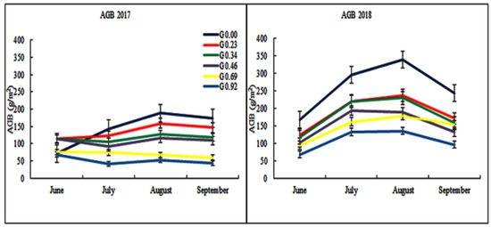 The AGB was higher in 2018 than in 2017, and it increased and then decreased with increasing grazing intensity. The AGB of G0.00 was higher than G0.23, but it had the same seasonal distribution in 2017 and 2018. Grazing intensity has a significant effect on AGB and showed a significant inter-annual change (p < 0.05, Table 1). The AGB of the G0.00 treatment was significantly higher than other treatments in each year (Figure 3). The greatest decrease in AGB was 64.1% and 59.3%, in 2017 and 2018, respectively, on the G0.92 treatment, as compared with the G0.00 treatment (p < 0.05).