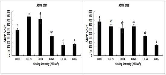 Grazing intensity and annual grazing intensity had significant effects on the ANPP production unit (p < 0.05) (Table 1). Significant differences (p < 0.05) were observed among the treatments for ANPP in both 2017 and 2018. In 2017, G0.23 had the highest ANPP, which was statistically similar to G0.34. However, in 2018, the G0.00 treatment had the highest ANPP, which was statistically at par with the other treatments, except for G0.92, which had the lowest ANPP (Figure 4). ANPP decreased with increased grazing intensity and decreased significantly at G0.92. In 2017, ANPP unit production decreased by 56% and 71% at G0.92, compared with G0.00 and G0.23, respectively, and by 67% and 63% at G0.92, compared with G0.00 and G0.23, respectively (Figure 4). In 2017 and 2018, with the increase in grazing intensity, ANPP decreased significantly. Generally, in 2017 and 2018, grazing reduced the productivity of production units, e.g., G0.00 and G0.23 in 2017 and 2018 (Figure 4). Moreover, after mid-August, the ANPP decreased as a result of the end of plant growth.