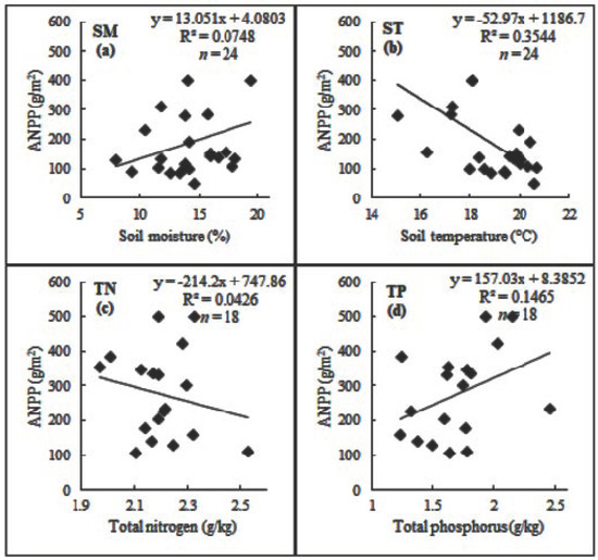 Soil moisture had a positive relationship with ANPP (R2 = 0.0748; Figure 8a), and the best relationship was between soil temperature and ANPP (R2 = 0.3544; Figure 8b), which was a negative relationship. The relationship between ANPP and soil total nitrogen (TN) was also negative (R2 = 0.0426; Figure 8c), while with total phosphorus (TP), a positive relationship was observed (R2 = 0.1465; Figure 8d).