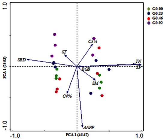 The principal component analysis (PCA) was used to explain the relationship between the plant components and soil factors. The two axes of PCA can clarify the difference in the dataset (Figure 9). C4 and C3 species showed a converse relationship. ANPP and belowground biomass (BGB) are naturally non-antagonistic. SM, ST, and soil bulk density (SBD) were also in converse relationships. The soil nutrient components, TN, and TP were more related to heavy grazing. Soil moisture was closely related to non-grazing, light grazing, and moderate grazing. C3 species were related closely to heavy grazing (G0.92), and C4 species were closely related to non-grazing and moderate grazing, whereas ANPP, BGB, and SM were closely related to non-grazing (G0.00), light grazing (G0.23), and moderate grazing (G0.46). Moreover, ST and SBD were closely related to the moderate grazing (G0.46) and heavy grazing (G0.92).