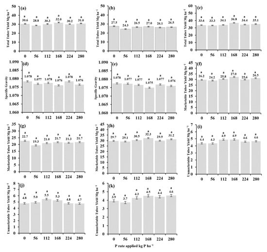 3.2.1. The Effect of Phosphorus on Total Potato Tuber Yield, Specific Gravity, Marketable, and Unmarketable Tuber Yield