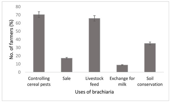The uses of brachiaria varied significantly across the study areas, except for those who exchanged the grass for milk (mean = 5%). Being a component of a pest management strategy, approximately 38% (mean) of farmers agreed that brachiaria reduced damage caused by cereal pests (Figure 1). Approximately 36% of the farmers considered the grass as a valuable fodder for livestock. About 29% believed that it controls soil erosion, while a few (17%) also sold the grass, others exchanged it for milk (Figure 1).