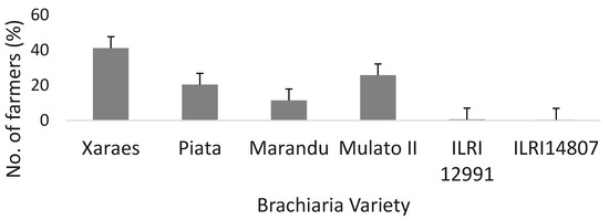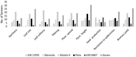 When considering the susceptibility of Mulato II to spider mites, there is a need to deploy alternative resistant genotypes, which possess same properties that make them preferred for egg laying by stemborer moths. However, for the successful uptake of such materials, farmers’ needs and opinions are key. Farmers evaluated and selected their preferred genotypes from candidate varieties proposed from previous studies, which evaluated drought tolerance, resistance to spider mites, biomass yield, and attractiveness to oviposition by stemborers [,,]. Xaraes was a highly preferred genotype, followed by Mulato II and Piata (Figure 3). Some of the traits that farmers proposed as a criteria in evaluating brachiaria genotypes are leaf hairlines, leaf size, leaf softness (as a measure of palatability by animals), number of tillers, plant spread, plant height, seed production, resistance to spider mites, and biomass yield. Farmers generally prefer less hairy genotypes for ease in cut and carry, because the hairs are irritating to the skin. They also believe that softer leaves are highly palatable and preferred by the animals, a trait for which they voted Mulato II as superior. However, there is a trade-off between hairlines and leaf softness in Mulato II and this might produce mixed results in farmers’ rating of the cultivar.
