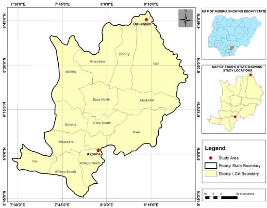Ebonyi State, Nigeria, showing the location of study communities in Akpoha and Onuenyim.
