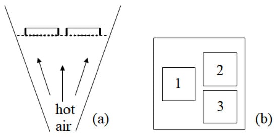 Continuous drying: (a) cross-section of the dryer showing the air flux, the grid and trays for the samples; (b) the positions of the trays on the grid are changed cyclically during the interruptions of the drying process to weigh the grains.