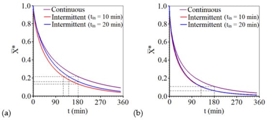 Table 5 shows that the values of effective mass diffusivity at 50 °C are equal to 2.0949 × 10−9 m2 min−1 (continuous drying), 2.9817 × 10−9 m2 min−1 (intermittent drying with tin = 10 min) and 2.5149 × 10−9 m2 min−1 (intermittent drying with tin = 20 min). Therefore, it is possible to observe through the obtained values that, indeed, the intermittency significantly increases the diffusivity of the process, compared to continuous drying. Among the intermittent drying processes at 50 °C, the one with tin = 10 min has the highest effective mass diffusivity, which results in saving of effective time, as can be observed in Figure 5a. Regarding the temperature of 70 °C, Table 5 presents similar values of mass diffusivity for the two intermittent drying processes, but significantly higher than the diffusivity of continuous drying, which can also be noted through Figure 5b.
