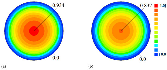 Distribution of moisture in the circular sections of rice grains, predicted by the diffusion model at t = 66 min, at 50 °C: (a) Continuous drying; (b) Intermittent drying (tin = 10 min).