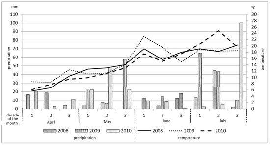 During the growing season, the temperature amplitude was similar for all three years of the conducted research (Figure 2). In 2009, however, April and the first two decades of June were characterized by warmer temperatures as compared to the rest of the year. The year 2010 was marked by a much warmer July. Distribution of rainfall also varied significantly. Modest precipitation was observed from the third decade of April to the second decade of June of 2008. During this time period, in any of the decades, the rainfall did not exceed 10 mm. In 2010, rainfall not exceeding 10 mm per decade was reported between the first decade of June and the second decade of July.