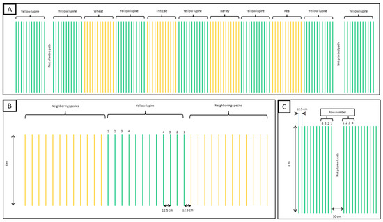 The source data come from a multiple 3-year field experiment. The layout of the experiment is demonstrated in Figure 3. The plot was 150 cm wide and consisted of 12 rows of plants separated by 12.5 cm. Figure 3A represents one of four replications (randomized complete blocks) with all the neighboring species of yellow lupine and their paths. The experimental treatment consisted of yellow lupine’s row layout (Figure 3B), four rows of separation termed PE (proximity effect) in relation to the neighboring species (wheat, triticale, barley, and oat) or separated from an unplanted path referred to as BE (border effect) (Figure 3C). The first adjacent row was located 12.5 cm from the first row of the neighboring species/path. The experimental plot consisted of successive plant rows each measuring four meters long. The mean result of each treatment of adjacent plants (from right and left sides of the plot) was considered as a single replication. Based on the results of previous studies [23], the fourth plant row was no longer subjected to the influence of neighboring plants, representing the internal canopy (control). The orientation of the plots’ longer side was north-south.