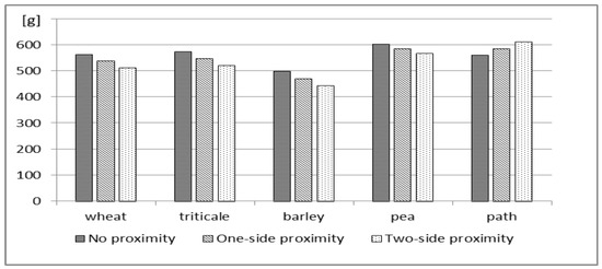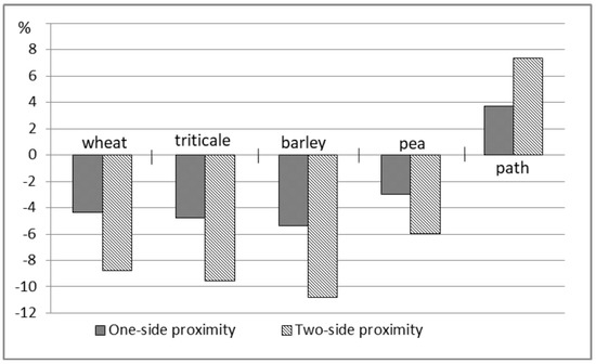 Under the existing experimental conditions, a negative effect of neighboring species in SI on yellow lupine yield was clearly demonstrated. This negative effect translates into SI production results (Figure 4). In the case of two-sided proximity, one must take into account the loss in lupine seed yield ranging from 6.00% (in the neighborhood of peas) to 10.8% (in the neighborhood of barley). However, separating adjacent strips of different species by a non-grown path (in the case of two-side proximity) may lead to an increase in lupine seed yield by 7.8% (Figure 5).