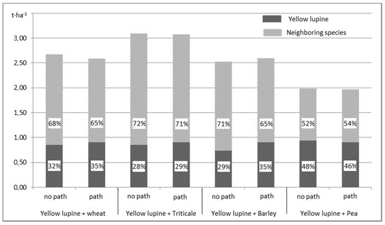 Introduction of a path was demonstrated to have a considerable effect on yellow lupine and resulted in a 7.8% increase in its yield. Furthermore, while taking into account the total yield of SI, the share of yellow lupine was also noticeably higher. Depending on species tested, the share of lupine seeds in the total yield of SI fell in the range of 29%–46%. SI of yellow lupine and triticale proved to be the most beneficial.