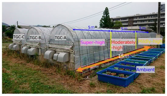 Three 15-m-long TGCs (Figure 1) were used to investigate the As accumulation in rice grains under high-temperature conditions. For the high-temperature treatments, the TGCs were set up in the paddy field at Shimane University, Matsue, Japan (35°29′ N, 133°04′ E, 4 m asl). To detect the temperature variation, we applied four temperature regimens, in order, from the entrance of the TGC to deep inside the TGC: ambient, mildly-high, moderately-high, and super-high-temperature treatments. The boundaries of each treatment section were separated by a transparent nylon curtain with vertical slits. A high-quality fan was attached on the back end of each TGC and continuously provided a gentle airflow from the entrance to deep inside the TGC to create more warm heat. This set-up provided an effective way to understand and measure the temperature variation from each of the four sections of each TGC. The temperature in the mildly-high plot is close to the outside temperature (ambient plot) because the airflow passes first through the entrance, and the temperature gradually increases toward the far end of the TGC (Figure 2).