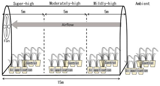 The heading date when 50% of the total heading occurred was 3 August. Seven days after the heading date (10 August), six pots (three control pots and three Si-application pots) were transferred to each of the four temperature treatments in each of the three TGCs. A total of 72 pots (6×4×3) was thus used in this study. These pots were grown in the TGCs until harvesting (19 September).