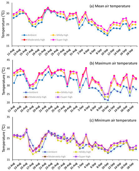 In contrast, the data in Table 1 show that the average daily air minimum temperature was 22.7 °C in the ambient, 22.6 °C in the mildly-high, 23.7 °C in the moderately-high, and 23.6 °C in the super-high sections during the ripening period. From the daily minimum temperature data, the difference in the average daily air minimum temperature during the ripening period was 1.1 °C. Based on the daily minimum temperature data, there were clear temperature differences between the four high-temperature treatments. We thus observed an effective and meaningful air temperature difference between the ambient-temperature sections of the TGCs and the three high-temperature treatments.