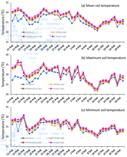 Changes in average daily mean soil temperature (a), daily maximum soil temperature (b), and daily minimum soil temperature (c) during the ripening period.