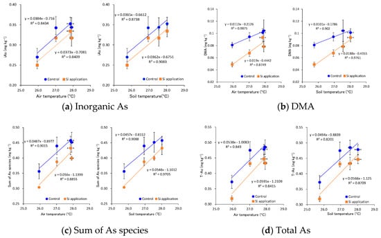The results of the ANCOVA revealed significant linear relationships between the concentrations of iAs, DMA, the sum of As species, and total As with the average air and soil temperatures during the ripening period (Table 3). The effect of the Si application on the concentration of iAs was nonsignificant when the significance level of 5% was used but was significantly reduced at the significance level of 10%. The concentrations of DMA, the sum of As species, and the total As were significantly reduced by the Si application at a significance level of <0.1%. These results confirmed that the increase in air and soil temperatures during the ripening period significantly increased the As concentration in brown rice, but the Si application was effective in reducing the As concentration in brown rice compared to the control at all of the temperatures used herein.