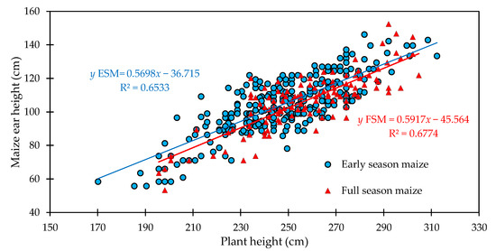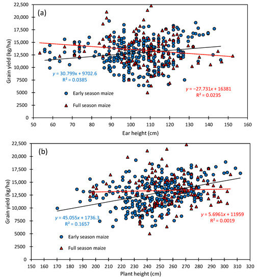 3.2. Relationship between Maize Grain Yield and Ear Height and Plant Height