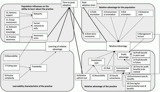 ADOPT employs adoption theories and literature to provide an operationalized conceptual framework of factors influencing the adoption behavior of farmers in project communities [20]. The adoption of agricultural innovations is explained by economic drivers including profitability, risk-related factors, social context, and extent of farmers’ engagement in testing technology under consideration [5,16,47]. In the ADOPT tool version for smallholder farmers, factors influencing the adoption of technologies in farming communities are categorized into two main groups: the relative advantage of technology and the effectiveness of the process of learning about technology [21,48]. Further, the relative advantage and learning factors are categorized into specific technology and population characteristics of the targeted farming community. At some points, population and technology variables may have linkages. For instance, the relative advantage of Gliricidia agroforestry technology may depend on its environmental benefits (a characteristic of the technology). However, the value of the environmental benefits of Gliricidia agroforestry technology depends on farmers’ attitudes towards various environmental benefits (a characteristic of the population). The relative advantage and learning factors are combined with their corresponding technology and the population characteristics to form four sets of issues (here referred as quadrants) that are considered for increased adoption of improved agricultural technologies such as agroforestry (Figure 2). The two ‘learning’ quadrants on the left hand are (1) population-specific influences on the ability to learn about the technology and (2) the learnability characteristics of the technology. Population-specific learning factors at the top left quadrant are farmers’ access to advisory support, group involvement, relevant existing knowledge and skills, and practice awareness. The technology-specific learning factors at the bottom left quadrant are observability, trialability, and innovation complexity (see Table 1 for descriptions). According to [49] the learning factors have no significant influence on the peak adoption level. However, the learning factors significantly influence the time to peak adoption [50]. This is because farmers take some time to learn about relevant information and experience before the subsequent adoption of the technology [20].