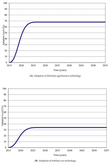 The ADOPT makes quantitative predictions and complements information from other qualitative approaches and farm decision tools, including farm surveys as well as economic and biological simulation models. [20] used ADOPT to predict adoption of the following practices in Australia: (a) autosteer (GPS guidance in tractors), (b) growing insect-resistant (Bt) transgenic cotton, (c) growing a new species of legume crop, (d) growing a new wheat variety, Mace, (e) using no-till cropping, and (f) planting saltbush forage shrubs. The results showed variations in peak adoption levels ranging from 9% (saltbush) to 98% (autosteer) in 9–23 years, respectively. [5], employed ADOPT to simulate the adoption of fertilizer micro-dosing and rainwater harvesting technologies using tied ridges. They noted the high peak adoption levels of between 90% and 94% to be attained in 10.5–11.5 years for fertilizer micro-dosing without and with tied ridges, respectively. [18] used ADOPT to simulate the peak adoption levels of introduced chicken strains in Bahi, Ifakara, and Wanging’ombe districts, Tanzania. They established the peak adoption levels ranging from 29% (Ifakara) to 38% (Wanging’ombe) in 7–9 years, respectively. [19] used ADOPT to simulate the peak adoption level of post-rice legume crop in Southeast Asia. The results revealed the peak adoption of 54% in 6 years. Thus, this study uses the ADOPT to predict the adoption of Gliricidia agroforestry and fertilizer technologies in the study sites.