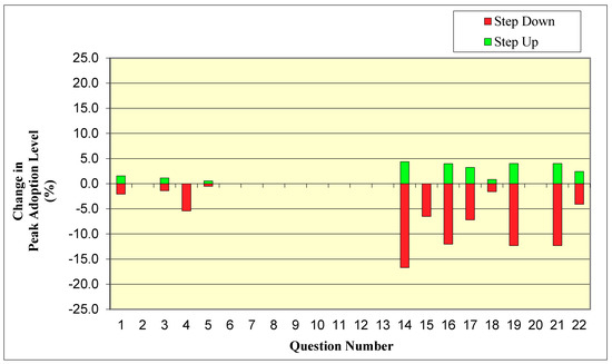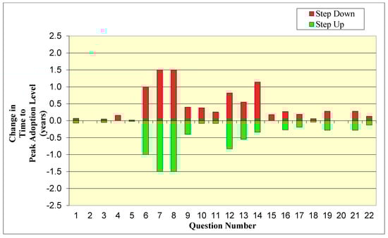 Secondly, ADOPT conducted the sensitivity analysis to assess the effect of changes in scores of variables on step changes in adoption indicators: step-up and/or step-down responses of peak adoption level (percentage) and time to peak adoption (years). For the peak adoption level, the step up and step down responses are the respective increase and decrease in proportion of potential adopters of the technology. The vice versa is true for time to peak adoption: the increase in the predicted time to peak adoption presents the step down response, other factors remaining the same. Likewise, previous studies on adoption prediction [5,18,19,20], conducted the sensitivity analyses to assess the effect of changes in scores of perception of ADOPT variables on step changes in peak adoption levels and the corresponding time, other variables remaining the same.