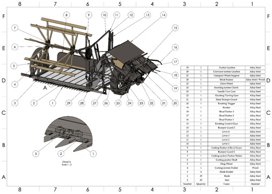 Among the main findings, it should be noted that the machine combines well-crafted chain and sprocket drives, which, together with a complex gearbox composed of parallel and bevel gears, render this reaper-binder a highly reliable machine. Furthermore, the inclusion of elements such as gimbal joints on shafts with possible misalignments, and of clutches to adapt the operation thereof to the needs of the operator, make it very versatile and functional without over-exerting the mechanics.