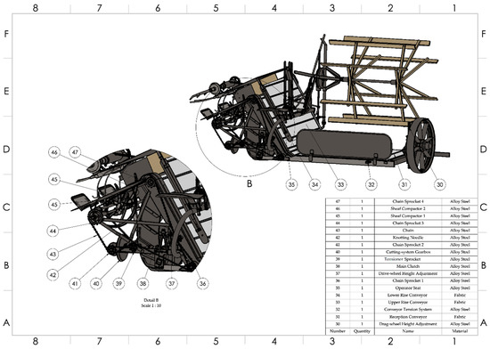 Finally, a front (Figure 33) and back (Figure 34) view is shown once all the elements that comprise the reaper-binder have been assembled, after applying all dimensional, geometric, and movement restrictions, and the constraints of the joints, in order to obtain a 3D CAD model as true to reality as possible.