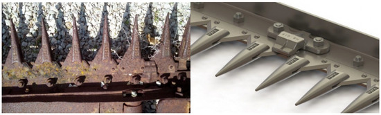 Cutting system with tines and blades (left) and its computer-aided design (CAD) three-dimensional (3D) model (right).