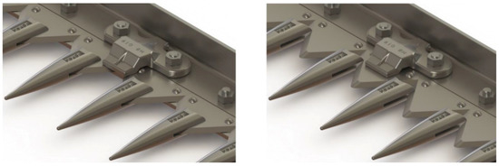 The oscillating movement of the blades on the tines is performed by a connecting rod/crank mechanism in which a rotary movement generated by the advance of the machine on the ground is transformed into an oscillating linear movement of the blades (Figure 5) which slide together between the tines. This sliding is possible due to the housing formed by the mounting of the tines on their support and to the upper bumper guards that prevent the set of blades from slipping out of position without exerting so much pressure thereon that it would halt the blades (Figure 6).