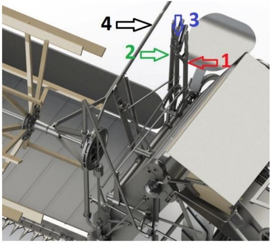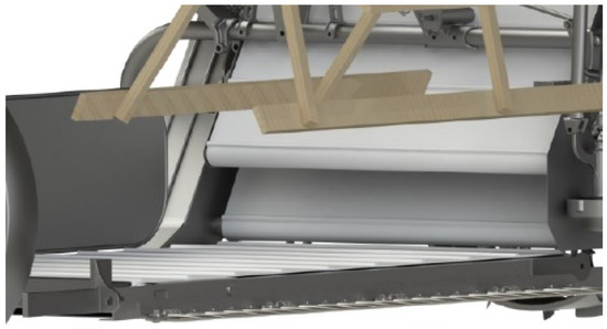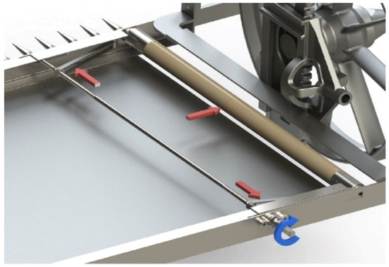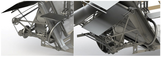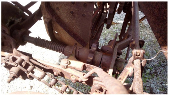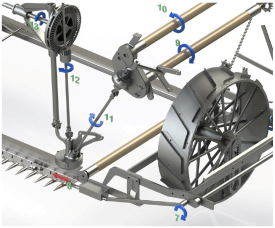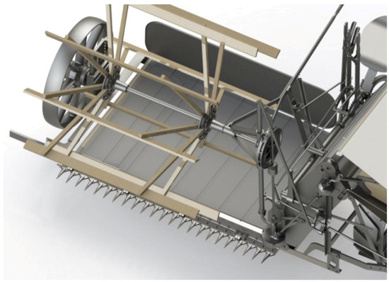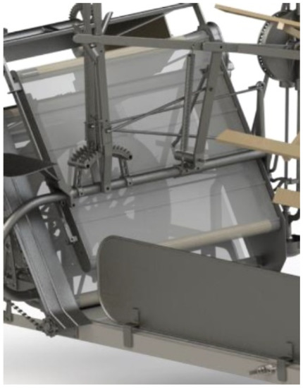 Furthermore, in order to facilitate the sowing input and to improve the cut, the machine has rotating pushers (Figure 7), adjustable in height from the operator’s seat, which push the sheaves inward, thereby preventing them from falling into the path of the machine. A sectional view of the sheaf pusher system is shown in Figure 8.