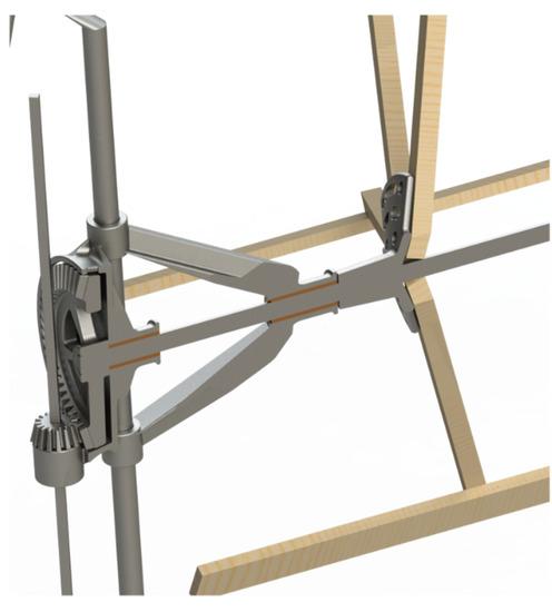 These rotating pushers are driven by bevel gears, whereby the driving gear is slid along its shaft of rotation to allow the height adjustment of this rotating pusher system (Figure 9). The supports of these pushers are jointly connected to the shaft that makes them rotate, which rotates on bronze bushings placed on the adjustable support. This support is perfectly designed to withstand the high-value bending moment generated by the weight of the pushers, by distributing the turning bushings at the correct distance in order to prevent overloading.