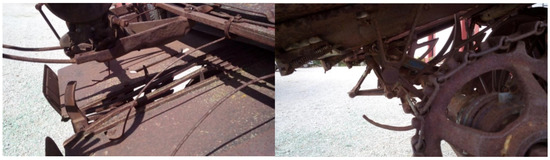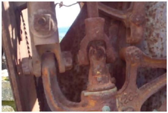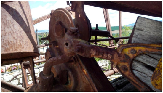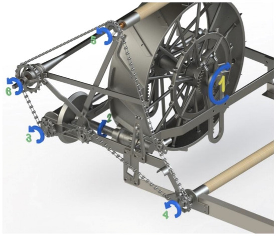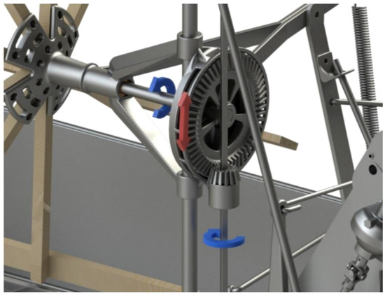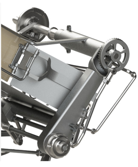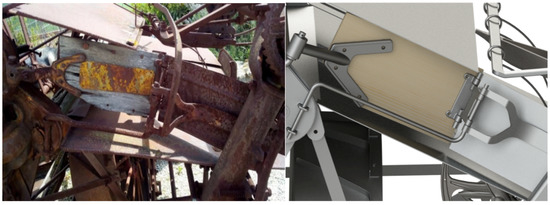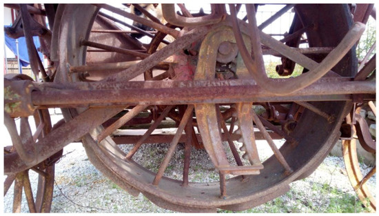 Undoubtedly, the success of this machine resides in the way that the traction force of the draft animals is converted to give rise to all the movements of the various elements of this machine, thanks to a drive wheel that rotates a series of shafts using sprockets and gears. Figure 25 shows two views (back and front) of the mechanical transmissions. As can be observed, at the rear is a chain that distributes the movement to the different shafts of the various systems.