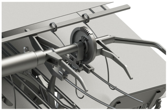 Moreover, this movement is accompanied by the movement of the knotter elements (Figure 24), which perform the knotting thanks to the knotting control gear. During the entire rotation of the knotter shaft, the pushers rotate, which, in their final movement, push the knotted sheaves out of the machine.
