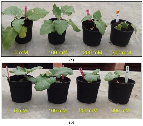 Visual observation of the plants after 25 days of treatment with increasing salinity levels revealed a concentration-dependent inhibition of growth, as compared with the non-stressed controls. Both species were affected, although the harmful effects of the salt were more evident in S. melongena than in S. torvum, especially at the highest salt concentration tested (300 mM NaCl). Some representative examples are shown in Figure 1.