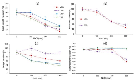 Variation of growth parameters in S. melongena (MEL) and S. torvum (TOR), in roots (MELr and TORr), and shoots (MELs and TORs), after 25 days of salt treatments at the indicated NaCl concentrations: (a) fresh weight of roots and shoots; (b) foliar area; (c) length of roots and stems; and (d) water content of roots and shoots. Values displayed are percentages of the corresponding controls (0 mM of NaCl), taken as 100%; absolute values are shown in Table S1.