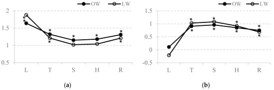Changes in the RYT (a) and Cb (b) values for the mixture of barley and rye-grass catch crop during the growth. OW—optimal water supply, LW—water supply reduced 50%; growth stage of barley: L—leaf development, T—tillering, S—stem elongation, H—heading, R—ripening; *—RYT significantly different from 1.0 (p = 0.05) and Cb significantly different from 0.0 (p = 0.05).