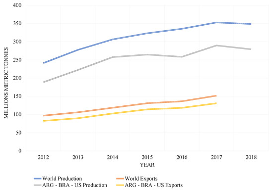 Argentina, Brazil, and the US are major players in global soybean production; together, they were responsible for 80.5% of world production between 2012 and 2018 and 86.2% of exports between 2012 and 2017 [20]. Figure 1 shows the evolution of world, Argentina, Brazil, and the United States soybean production and exports for these periods.