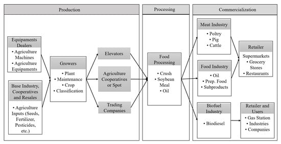 This market has huge significance for exporters. The Brazilian revenue for exports of this product in 2017/2018 was approximately US$ 25.7 billion, representing 13.75% of the country’s GDP [29,30]. The soybean supply chain is presented in Figure 2.