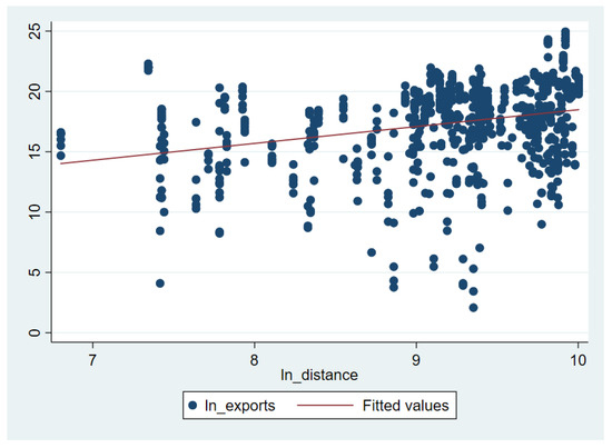 To explore the influence of logistics on soybean trade, we utilized an augmented gravity model. This model is based on the gravity equation that is used to explain international trade [12,13,14,15,16,17,41,50]. Generally, the gravity equation model is represented by Equation (1) [51]: