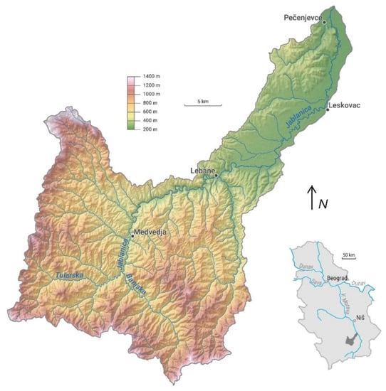 The Jablanica River Basin covers the territory of Southern Serbia, with an area of 909.74 km2 and a total stream length of 102.6 km (Figure 1). The elevation ranges from 202 m to 1408 m above sea level. The average altitude of the basin is 590 m. Up to an altitude of 500 m, 35.63% of the basin area is located, 61.6% between 500–1000 m and 2.77% of the basin area is above 1000 m.