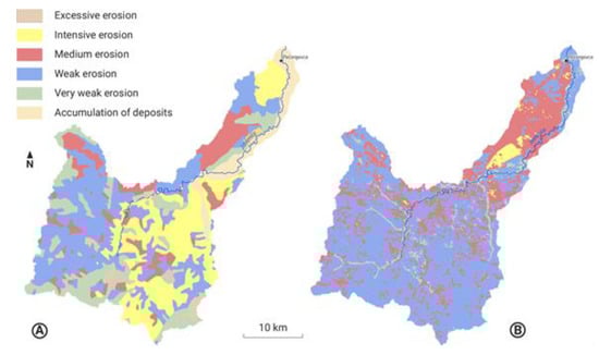 The erosion coefficient of 1971 was 0.432, with a specific sediment load production of 654.41 m3/km2/year. In the basin, 28.3% of the territory was affected by severe and excessive erosion. Areas under medium erosion covered 12.7% of the territory, weak 34.3% and very weak 17.6% (Figure 2A). The most obvious changes in the period 1971–2016 are related to the I and II categories of erosion, which covered only 1.76% of the basin area in 2016. As areas under severe erosion decreased, areas under medium erosion increased, where, according to the 2016 map, 28.8% of the basin area was threatened. In the 2016 erosion map, the greatest share was covered by areas under weak erosion, 65.4%, followed by medium erosion, 28.8%. The erosion coefficient was determined as 0.360, with a specific sediment load production of 472.03 m3/km2/year, which indicated a decrease in sediment load production in the period 1971–2016 of 28% (Figure 2B). A slight increase in the erosion intensity was observed in the lower parts of the basin, along with the river flow, which was characterized by an increase in arable land, an increase in the population (primarily the agricultural population) and the degradation of forest cover in the part of the basin that was heavily influenced by human activity. Mountainous and sub-mountainous parts of the basin, although possessing topographic potential for intensive erosion in the period 1971–2016, recorded a decrease in the intensity of erosive processes (Figure 2).