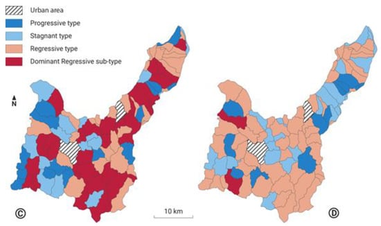 A regressive type of settlement with values of net relative change less than (Rj% > −47%) and (Rj% > −47.5) belongs to the dominant regressive sub-type. This type of settlement is characterized by an advanced phase of depopulation, where there was a rapid decline in the total population during the survey period. This type of settlement remains without an agricultural population so that the areas under arable land do not decrease but record stagnation and belong to the stagnant type. The types of settlements according to the change in the number of inhabitants (C) and arable land areas (D) for 1961–2011 are given in Figure 3. The typology of population dynamics and changes in the arable land surface was analyzed for the period 1961–2011, and an analysis was done of the change in erosion intensity for the period 1971–2016. The reason for this discrepancy in the periods is that the most intense changes in demographic and agrarian geographical transformation began in the 1960s and their results became visible in the early 1970s, as identified by earlier studies [47,48].