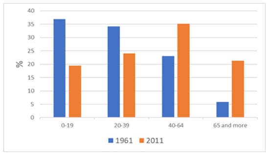 The drastic decrease in the total population is the result of natural and mechanical movements (migration) of the population. A direct consequence of these movements is a disruption of the age structure. Age structure is a unifying factor between the condition and quality of the population, which is reflected in how the land is used, especially in rural areas [33]. The analysis of the age structure of the population is based on the observation of the share of large age groups: young population (up to 19 years); younger middle-aged (20–39 years); older middle-aged (40–64 years old) and old population (over 65 years old). In 1961, the young population made up 36.9% of the total population, and in 2011 only 19.5% of the total population. The proportion of the younger middle-aged population was reduced from 34.2% in 1961 to 23.9% in 2011. The aging process of the population has been identified, as the older middle-aged and elderly population increase. In the same period, the middle-aged population increased its share of the total population from 23% to 35%, while the elderly population increased from 5.7% to 21.3% (Figure 4). This indicates the demographic aging of the population, which was also reflected in the manner of land use, and in this connection there was a reduction of erosive processes in the areas affected by the processes of depopulation and the aging of the population.