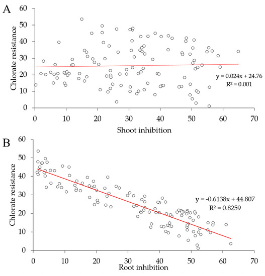 Correlation between seedling growth inhibition and chlorate resistance. (A) Predicted correlation (weak positive) between shoot inhibition percentage and chlorate resistance score and (B) predicted negative correlation between root inhibition and chlorate resistance phenotypes.