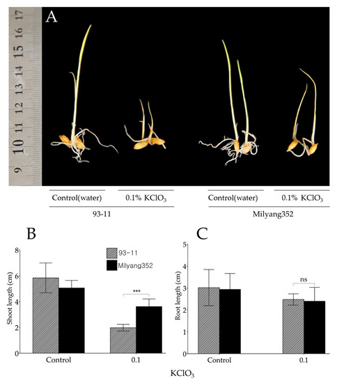Distinctive phenotypic response of 93-11 (indica, P1) and Milyang352 (japonica, P2) toward potassium chlorate (KClO3). (A) Phenotype of parental lines used for the development of doubled haploid lines under 0.1% KClO3 treatment. Picture was captured 7 days after KClO3 treatment by irrigation. The background of the picture was removed for clear visualization using Adobe Photoshop (Version: 13.0.1., Adobe Inc., San Jose, CA, USA) (B,C) Shoot and root growth pattern of 93-11 compared to Milyang352. *** p < 0.001, and ns, non-significant.