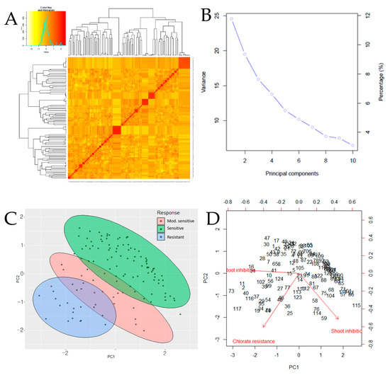 The KASP marker-based kinship matrix (Figure 4A), also known as co-ancestry or half-relatedness, showed the distribution of coefficients of co-ancestry, with the stronger red color indicating individuals that were more related to each other or shared genomic regions derived from common parental lines (93-11 × Milyang352). The principal component analysis (PCA) revealed the contribution from three principal components (PCs) (Figure 4B). In addition, a weak correlation between shoot or root inhibition reduction and chlorate resistance level was observed (Figure 4C). Principal components 1 (PC1) and 2 (PC2) explained about 44.9% and 34.6%, respectively, of the total variation of the phenotypic response of the DH lines, which resulted in the cumulative proportion of 79.5% (Figure 4D). PC1 predicted the existence of a positive correlation between shoot inhibition and chlorate resistance, whereas PC2 suggested a negative correlation between root inhibition and chlorate resistance.