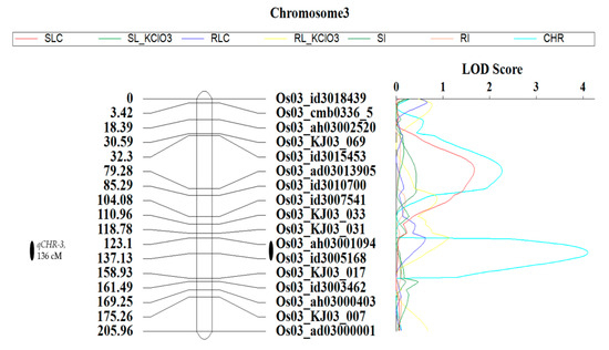 Linkage map and identified QTL associated with chlorate resistance in rice. The significant QTL for chlorate resistance was detected on chromosome 3 (136 cM) in rice. KASP markers associated with the QTL qCHR-3 with logarithm of the odds (LOD) above the threshold set at 3 were Os03_ah03001094 (left, 126.5 cM) and Os03_id3005168 (right, 146.5). Left side of the linkage map shows the position of the mapped KASP markers in cM (right side). The LOD profile is displayed on the right side of the linkage map. SLC, shoot length with no treatment; SL_KClO3, shoot length with treatment; RLC, root length without treatment; RL_KClO3, root length after treatment; SI, shoot inhibition percentage; RI, root inhibition percentage; and CHR, chlorate resistance in percentage.